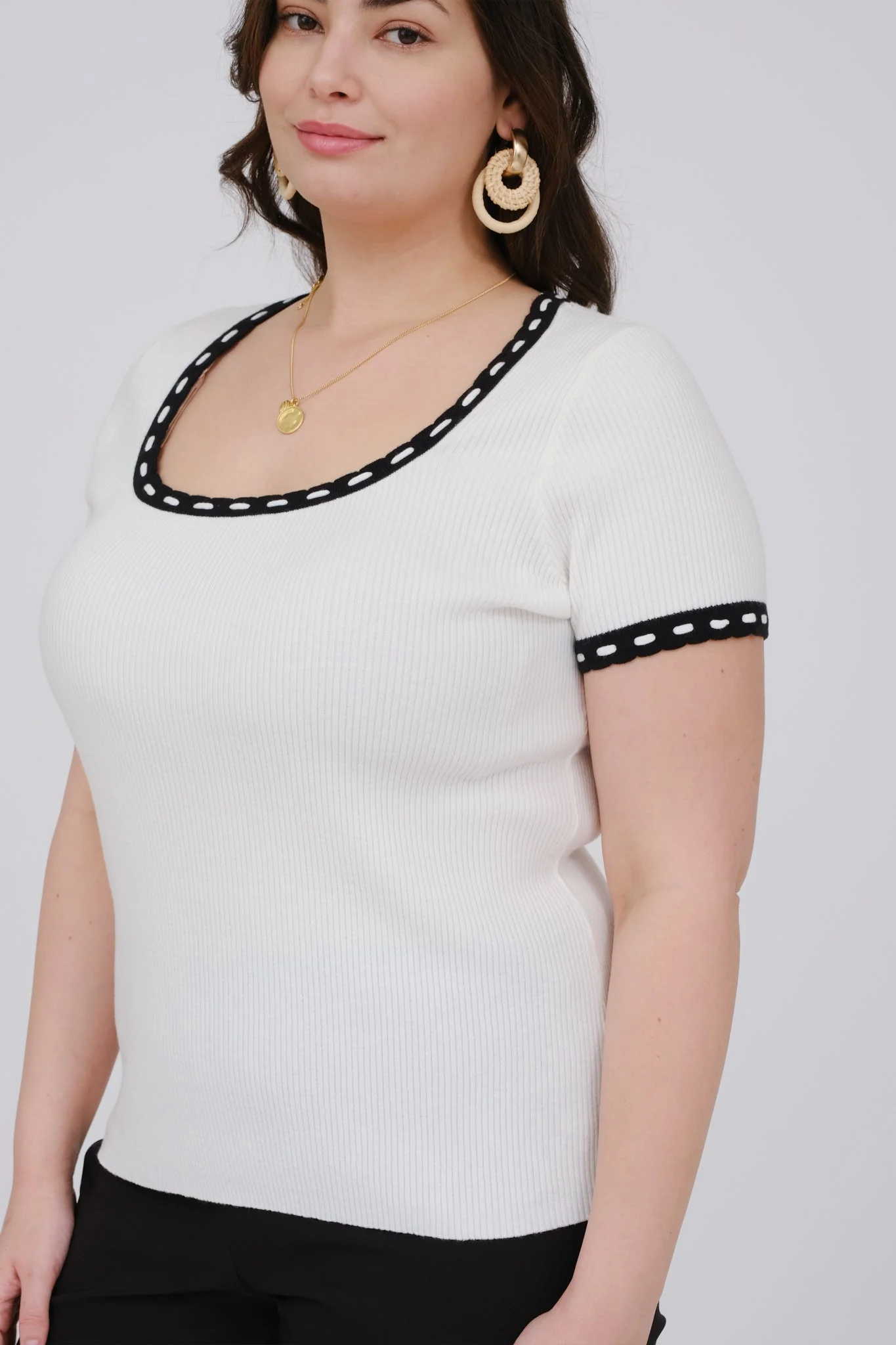 Get cozy and cute with our Contrast Trim Short Sleeve Knit Top! Made with stretchy knit material, this lightweight black ribbed sweater features a scoop neck and cream contrast at the neckline and sleeve hem. Perfect for a casual day out!