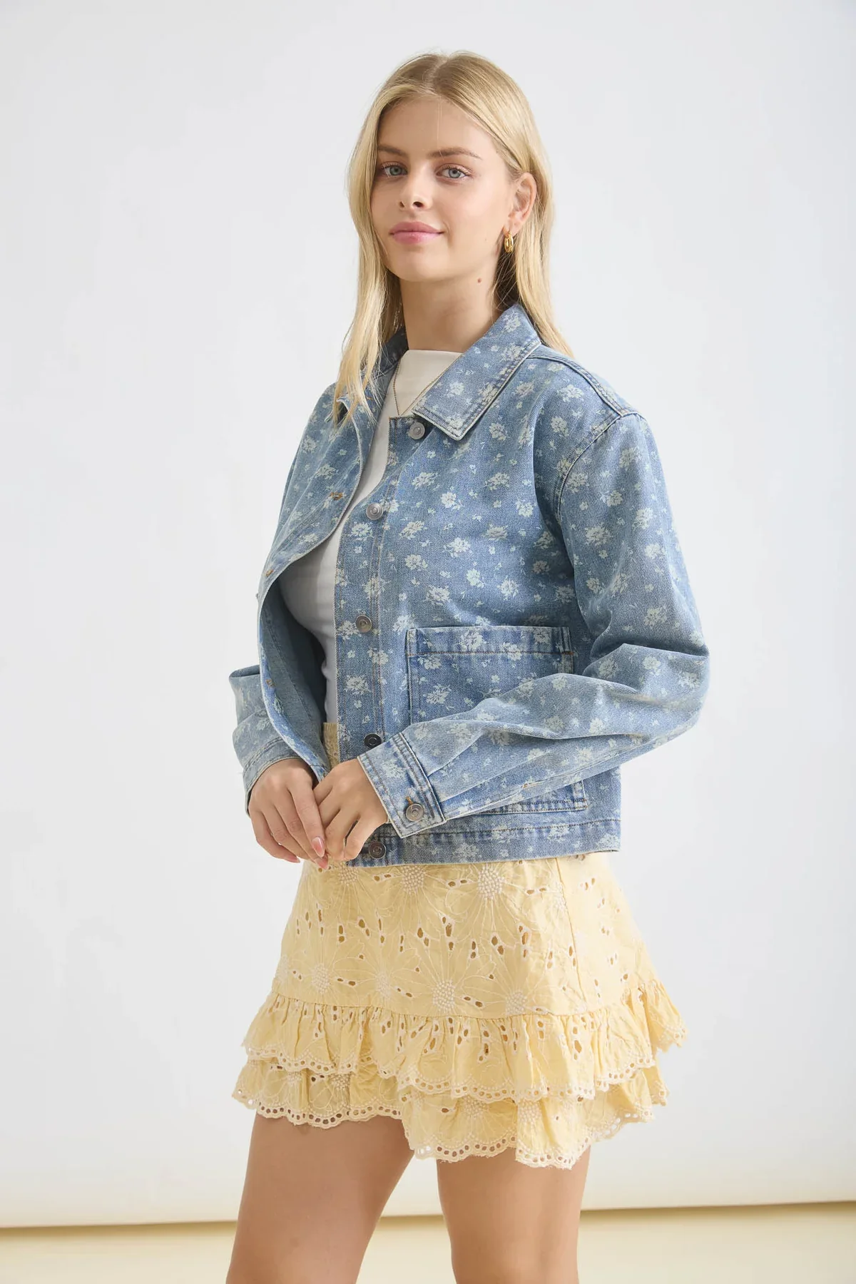 Throw on this adorable washed denim jacket and instantly elevate your look! Featuring a charming floral print that brings feminine flair to any outfit, this collared button-down style is perfect for layering over dresses, tees, or anything in between. The soft, vintage-inspired denim gives off effortless cool-girl vibes while the trendy floral design keeps things fresh and fun. Whether you're dressing up or keeping it casual, this jacket is your new go-to piece for adding that perfect pop of personality to your wardrobe.