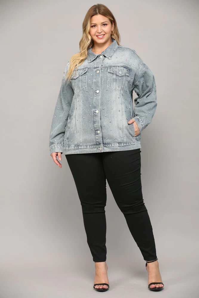 Get ready to rock some rhinestone embellishments with this light washed denim jacket! Perfect for any plus size fashionista, this trendy and fun jacket adds a touch of sparkle to any outfit. Upgrade your denim game with this must-have piece.
