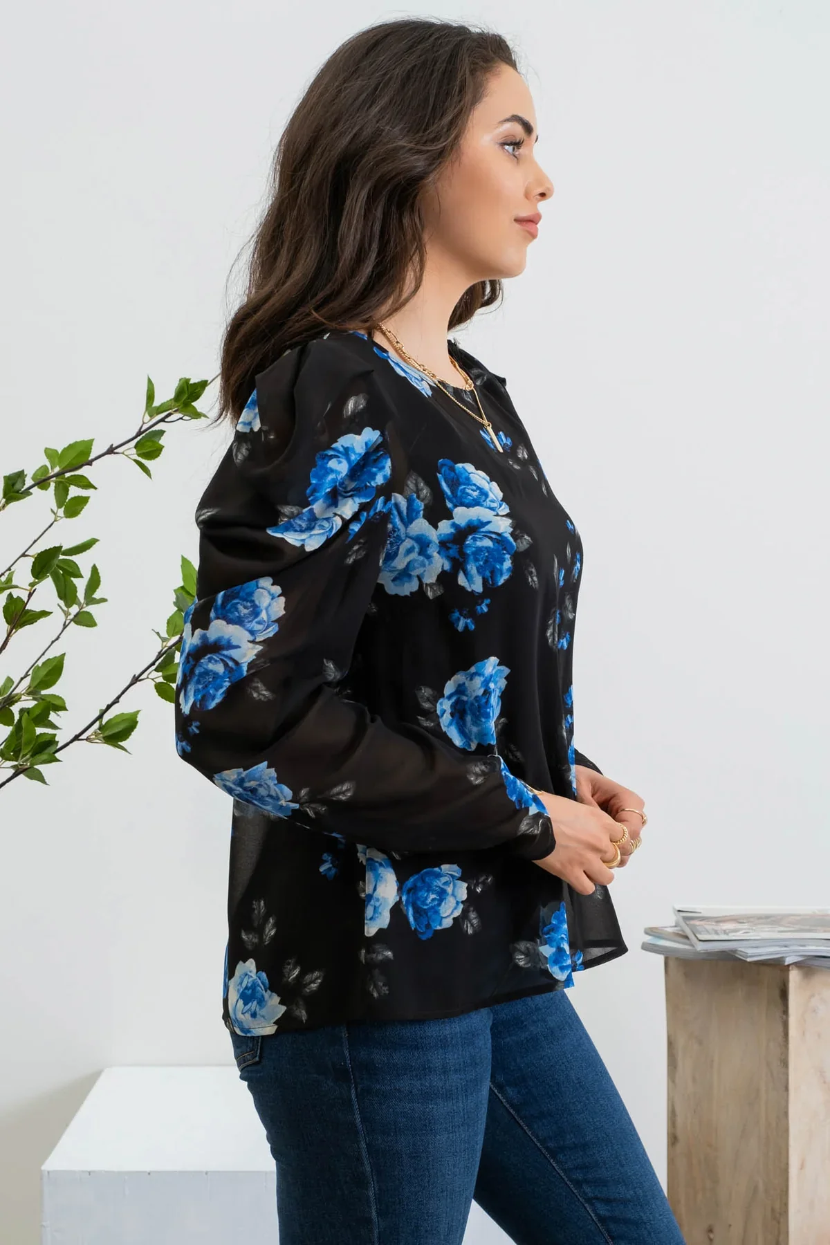 Elevate your wardrobe with this sheer black blouse adorned with a beautiful blue flower pattern. The long ruched sleeves add a charming touch while the 3 jewel buttons on one shoulder provide a unique twist. Perfect for adding a pop of color to any outfit.