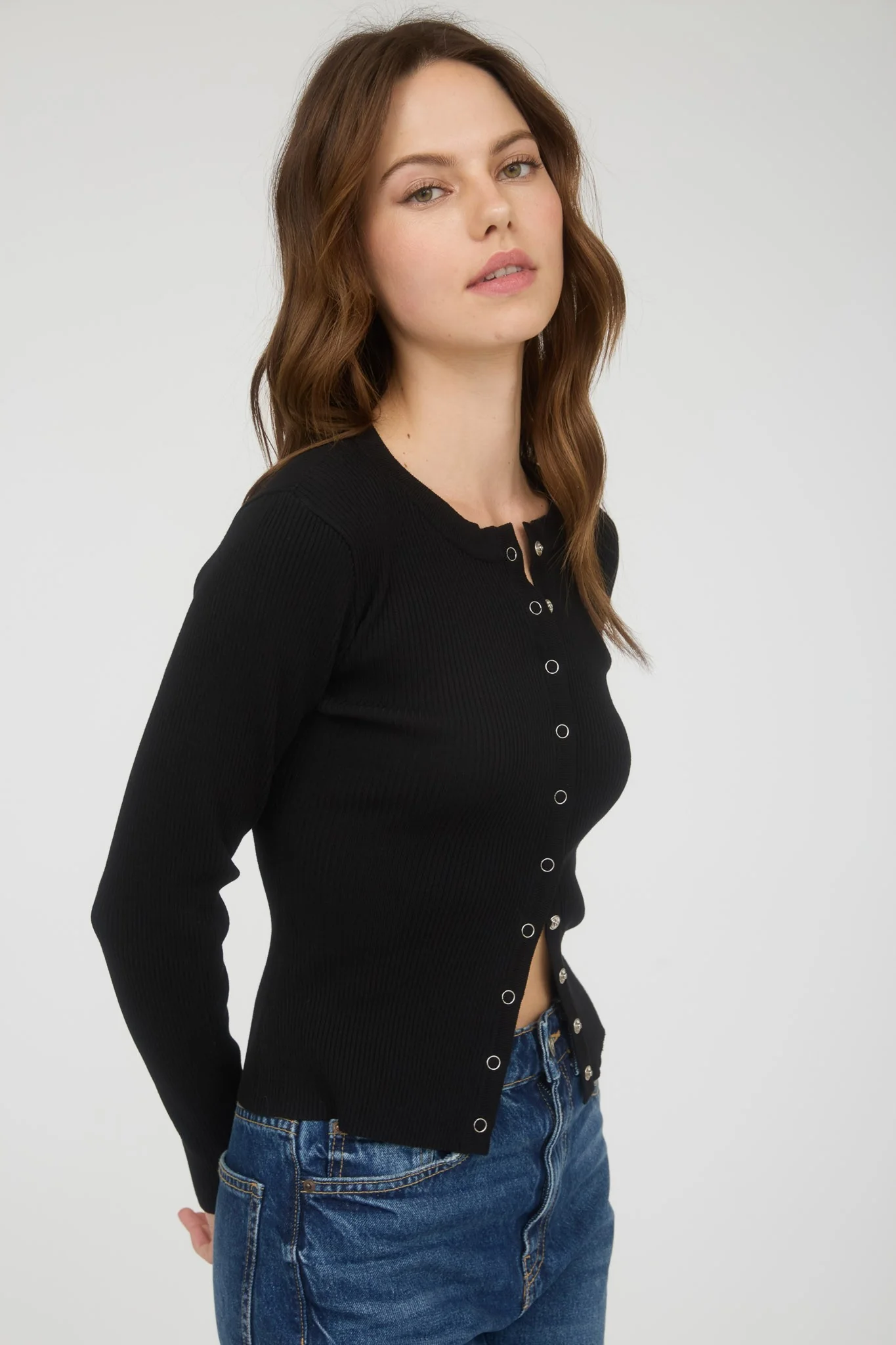 Snap Front Stretchy Ribbed Cardigan (Black)