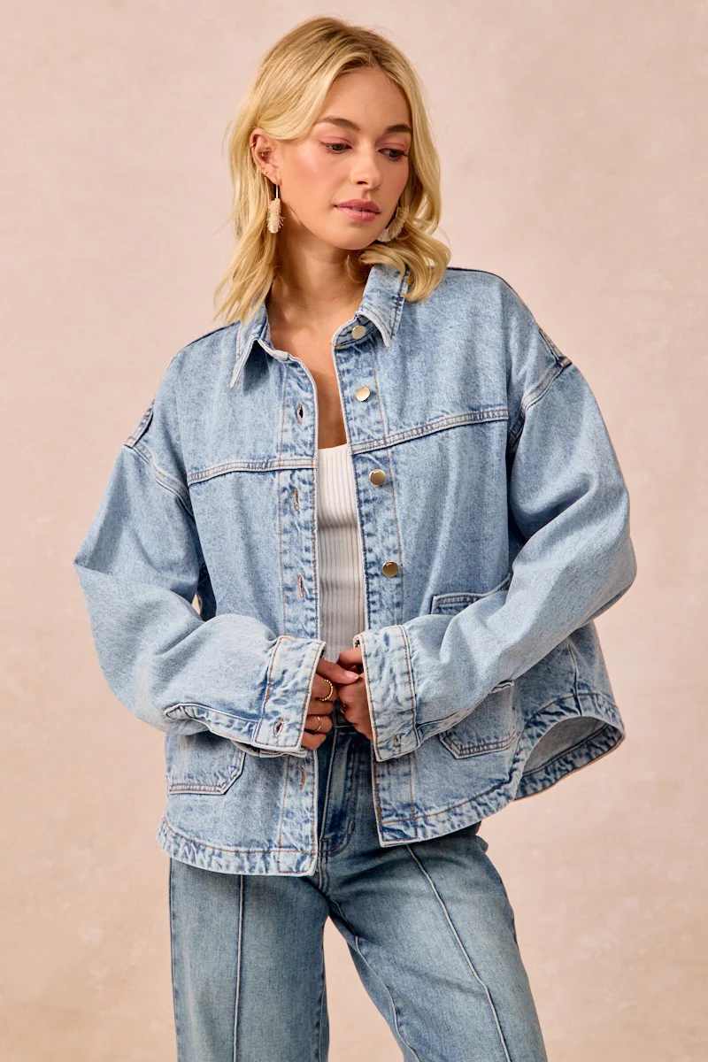 Throw on this oversized denim jacket and instantly level up your vibe. The washed finish gives it that effortlessly cool, lived-in feel, while the rounded hem adds an unexpected twist that sets it apart. Roomy front pockets? Check. A subtle back pleat for movement and dimension? Double check. Whether you're layering over basics or dressing up a casual fit, this jacket is the kind of piece that makes everything look intentionally put-together. Denim done right.